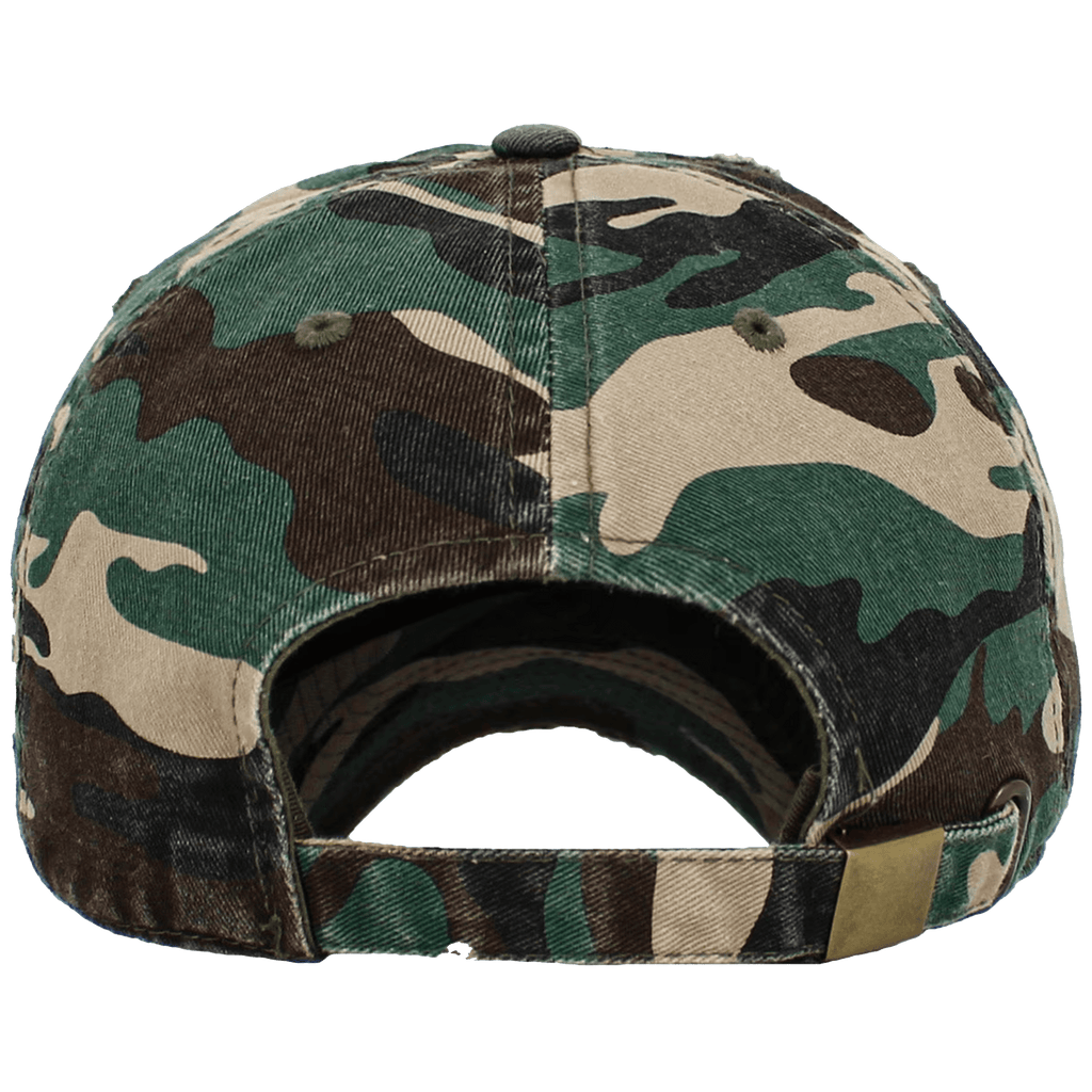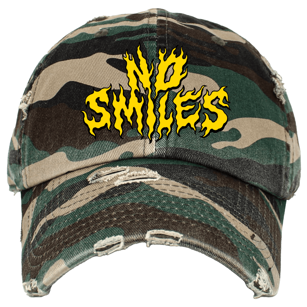"No Smiles Yellow Puff Embroidery" | Distressed Camo Hat [ONLY 5 MADE]